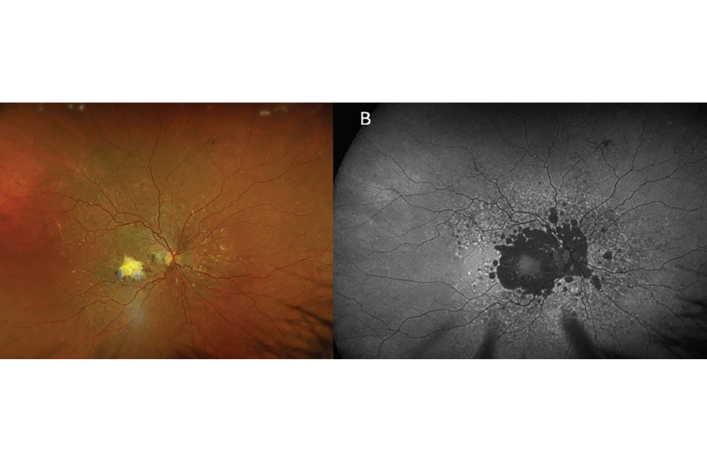 Existen innumerables aplicaciones de la FAF en la práctica clínica, siendo la más práctica detectar o monitorear la progresión de la AG en pacientes con DMAE. El Informe 3 de la Reunión sobre Clasificación de Atrofia (CAM) describió los hallazgos de la FAF en la AG como (1) bordes claramente demarcados, (2) una señal de hipo-AF similar a la cabeza del nervio óptico o los vasos sanguíneos de la retina, y (3) un diámetro de ≥250 µm. 10 La detección temprana de la AG es importante para la educación del paciente sobre su estado de enfermedad, así como para una posible intervención terapéutica. Alternativamente, la FAF se recomendó en las pautas de la Academia Estadounidense de Oftalmología de 2016 para la detección de la maculopatía por hidroxicloroquina y se recomienda anualmente además de la OCT y la prueba del campo visual 10-2 después de cinco años de uso del fármaco. 11 La FAF de campo ultra amplio también es una herramienta poderosa para detectar la enfermedad retiniana hereditaria o la enfermedad uveítica, las cuales a menudo tienen hallazgos tempranos sutiles en el examen clínico ( Figura 5 ).