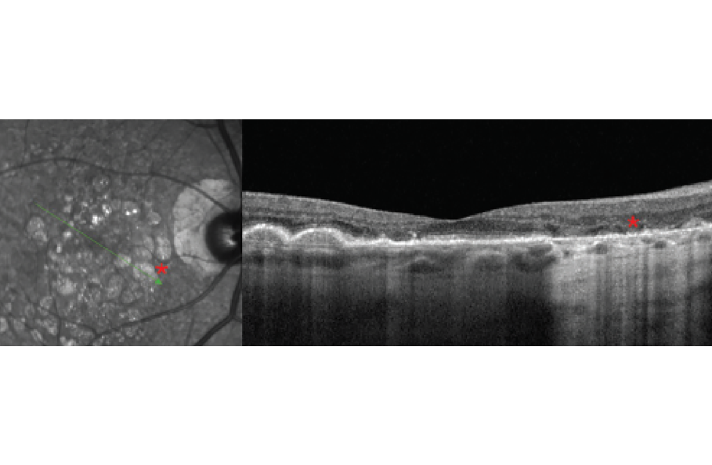 Si bien las imágenes infrarrojas tienen una alta sensibilidad para la detección de enfermedades degenerativas de la retina y la mácula, también se han utilizado para el diagnóstico de diversas afecciones sistémicas, como la neurofibromatosis tipo 1 (NF1). La NF1, una afección autosómica de herencia dominante, conduce a la proliferación de células de la cresta neural, lo que causa la formación de varios hamartomas y tumores. 14 Algunos hallazgos característicos de la NF1 son manchas café con leche, pecas inguinales, nódulos de Lisch en el iris y, recientemente, anomalías coroideas irregulares brillantes visibles con imágenes nIR del fondo de ojo ( Figura 8 ). Histológicamente, estas áreas eran grupos de melanocitos y se denominaron hamartomas melanocíticos. Estas anomalías coroideas en la OCT infrarroja, junto con los nódulos de Lisch, forman parte del criterio diagnóstico revisado para la NF1, que se actualizó en 2021. 15 Se cree que estas lesiones son visibles con infrarrojos debido a su alta concentración de melanina, que parece brillante con luz infrarroja. 14